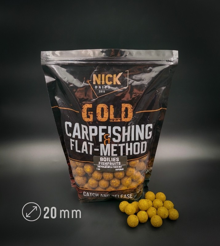 Nick Baits «GOLD» FISHFRUITS -это спортивная серия вареного бойла длительного действия. Бойл продуман так, что его оболочка достаточно плотная, чтобы долго не растворятся в воде и держать форму, а внутренняя часть приманки- рыхлая. Такой бойл может долго находится в точке ловли, и мелкая рыба не сможет его съесть. В рецептуре данной серии бойлов собрано сбалансированное содержание животных и растительных белков, углеводов и аминокислот. Для более быстрой работы бойла, рекомендуется его крушить или резать.