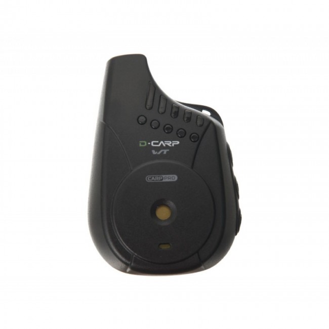 К ресиверу можно подключить до 5 сигнализаторов поклёвки Carp Pro D-Carp WT. Дальность работы ресивера: 250-350 метров. На его передней панели расположены светодиоды-индикаторы, соответствующие каждому из сигнализаторов поклёвки. Сбоку имеются кнопки для настройки звука, установки режимов «вибро», «синхронизация» и пр. Предусмотрены функции «фонарик», предупреждение о недостаточном заряде элементов питания и пр. Ресивер укомплектован брендированным шнурком.