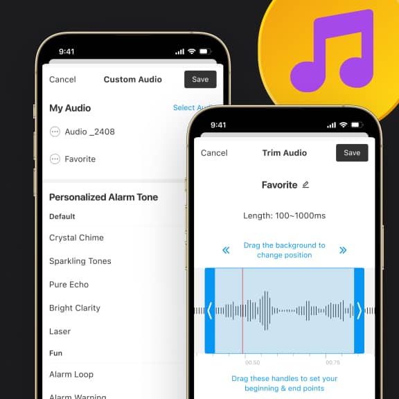 Персонализируйте каждый сигнализатор Cube с помощью настраиваемых звуковых оповещений. Запишите свой голос или выберите понравившийся вам звук, музыку, чтобы звук каждого сигнализатора был уникальным и загрузите его в сигнализатор. Будьте начеку и каждый раз получайте удовольствие от индивидуального подхода.