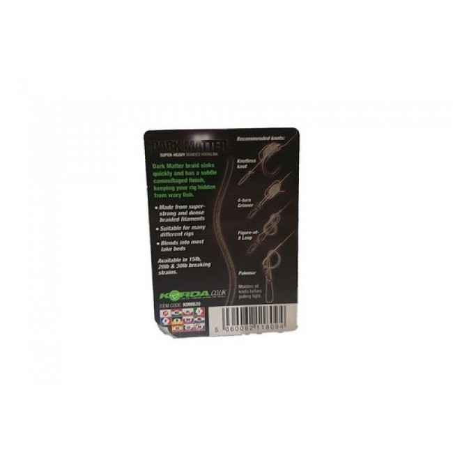 Korda Dark Matter Braid — очень мягкий, плетеный, поводочный материал из линейки Dark Matter, а это означает, что волокно дополнительно огружено. Особый тип плетения волокна позволяет добиться высокой прочности и износостойкости.