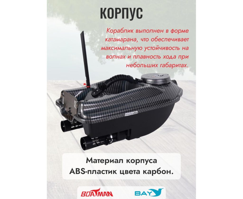 Корпус кораблика выполнен в форме катамарана, что обеспечивает максимальную устойчивость на волнах и плавность хода при небольших габаритах