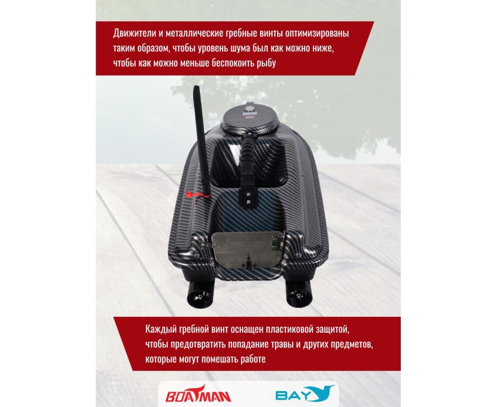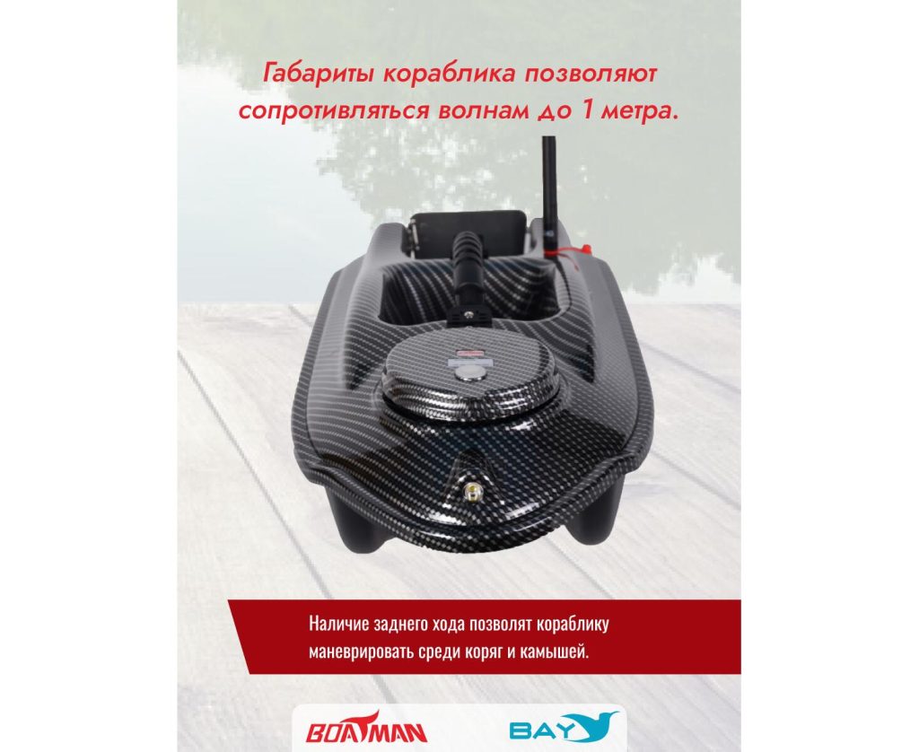 Корпус кораблика изготовлен из прочного пластика ABS с удобной ручкой для переноски. Габариты кораблика позволяют сопротивляться волнам до 1 метра. Наличие заднего хода позволят кораблику маневрировать среди коряг и камышей. Использование кораблика на расстоянии до 500 метров происходит благодаря пульту управления на 2.4 ГГц.