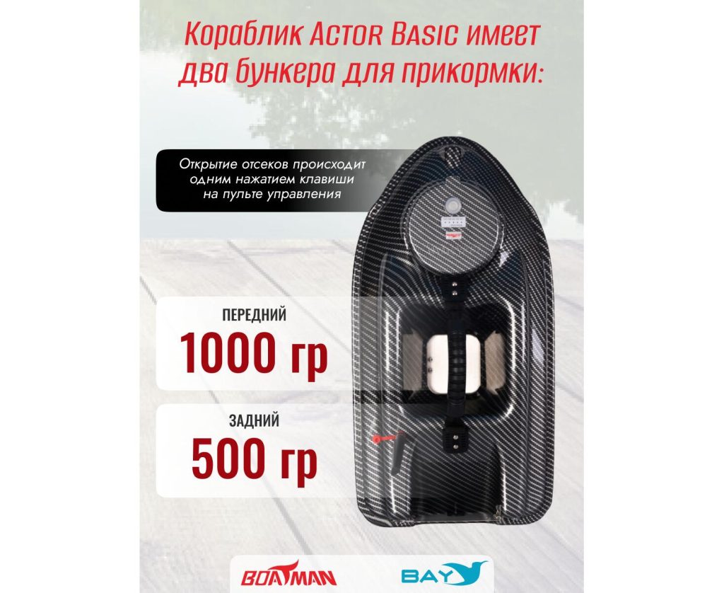 Кораблик Actor Basic имеет два бункера для прикормки: передний вместительностью 1000 грамм и задний вместительностью 500 грамм. Открытие отсеков происходит одним нажатием клавиши на пульте управления. Actor Basic также может буксировать леску с крючком или фидер («донка»). Кораблик оснащен передними, боковыми и задними светодиодными фонарями для рыбалки в ночное время. Они встроены в верхнюю часть лодки, поэтому не светят прямо на воду. Передний светодиод белый и предназначен для определения направления лодки при возврате к берегу, задние — красные, отображают повороты в ту или иную сторону, а боковые — зелёные, определяют положение кораблика в тёмное время.