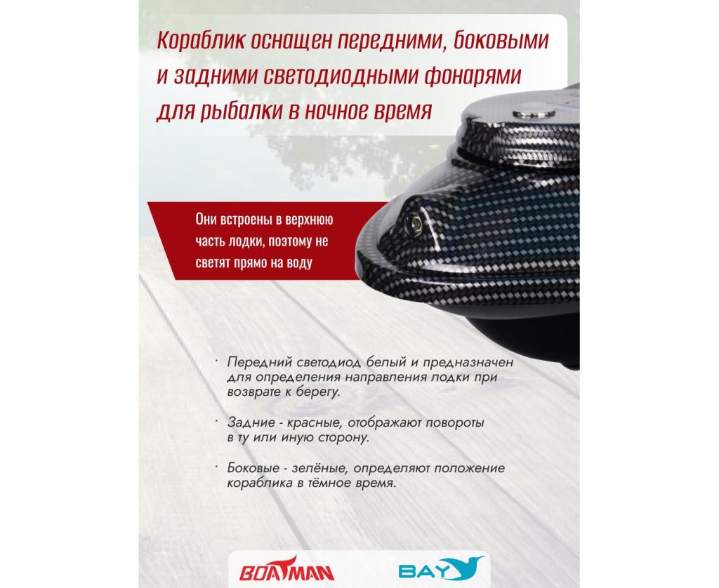 Передние и задние огни позволят вам пользоваться корабликом в любое время суток, а также облегчит его обнаружение на больших дистанциях