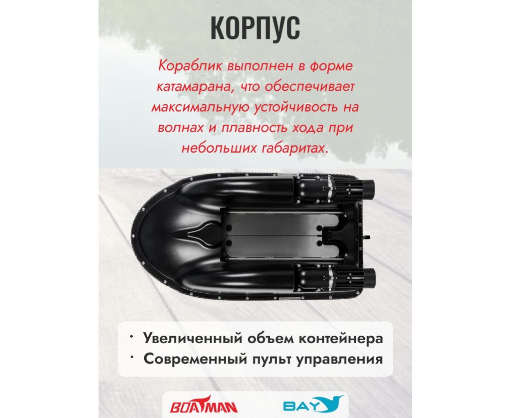 Корпус кораблика выполнен в форме катамарана, что обеспечивает максимальную устойчивость на волнах и плавность хода при небольших габаритах