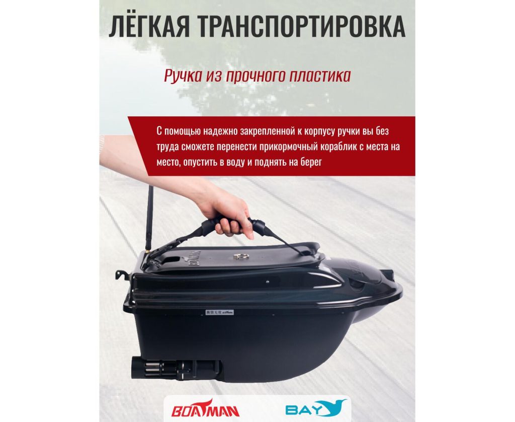 С помощью надежно закрепленной к корпусу ручки вы без труда сможете перенести прикормочный кораблик с места на место, опустить в воду и поднять на берег