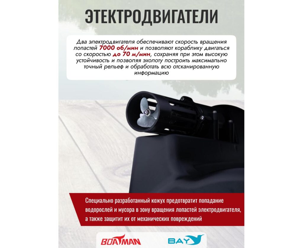 Два электродвигателя обеспечивают скорость вращения лопастей 7000 об/мин и позволяют кораблику двигаться со скоростью до 70 м/мин, сохраняя при этом высокую устойчивость и позволяя эхолоту построить максимально точный рельеф и обработать всю отсканированную информацию