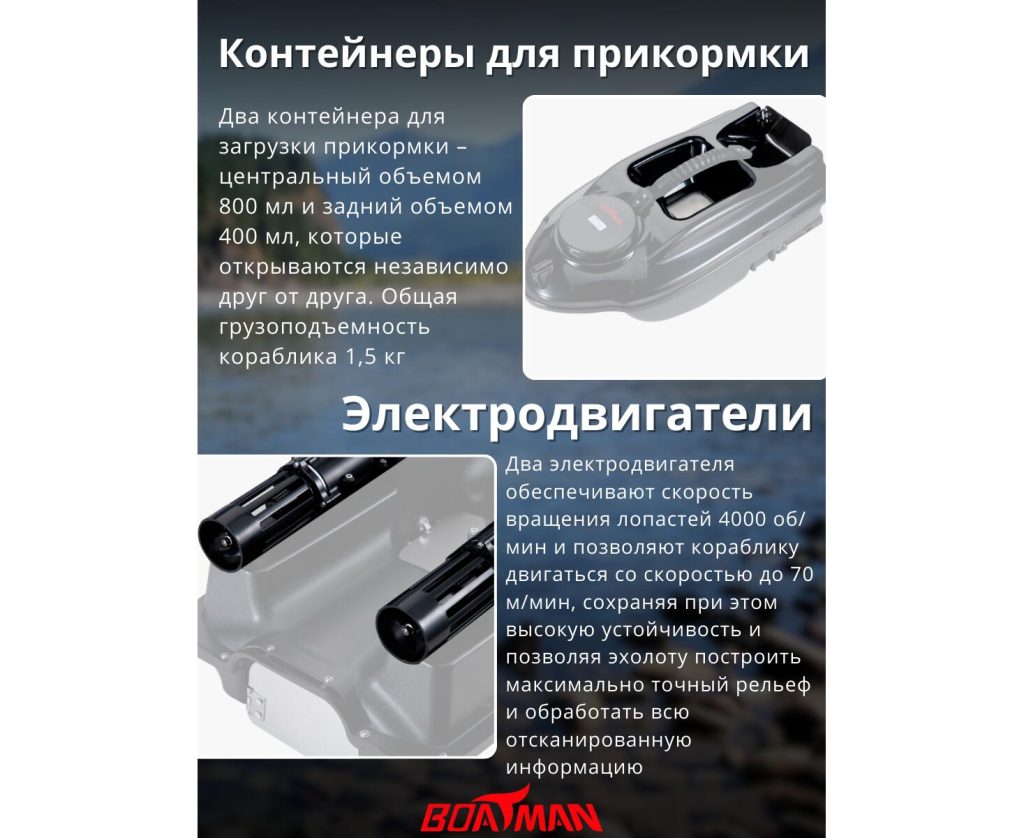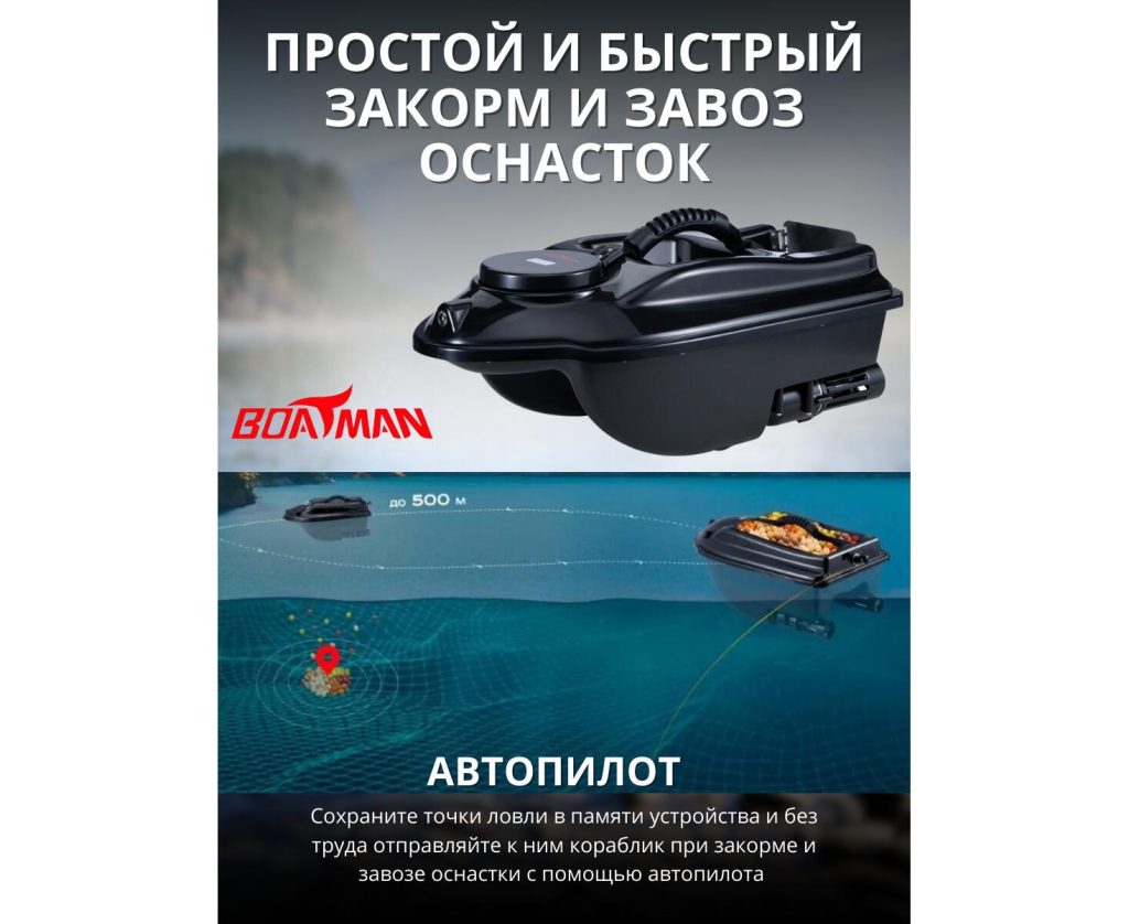 Найдите самые перспективные точки с помощью встроенного эхолота собственной разработки с отдельным цветным дисплеем высокого разрешения. Сохраните точки ловли в памяти устройства и отправляйте в них кораблик со сбросом прикормки и оснастки благодаря встроенному GPS-модулю, а функция автовозврата обеспечит возвращение кораблика в домашнюю точку при потере связи или низком заряде аккумулятора.