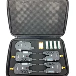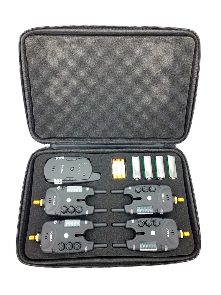 Беспроводной приемник (пейджер) — 4 сигнализатора поклевки — Инструкция с перечнем функций каждого типа приборов. (на англ. языке) — Удобный кейс для хранения и транспортировки. — Батарейки