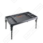 Компактный, удобный и легкий столик. Благодаря складной конструкции занимает весьма мало места. Телескопические ноги позволяют изменять высоту столика и располагать его на неровном берегу. Имеет бортики, которые разделяют рабочую поверхность стола на отделения и не позволяют предметам падать на землю. Таким образом, столик позволит качественно подготовить насадку или найти нужные вещи.