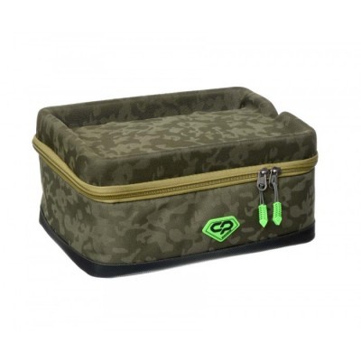 Carp Pro Diamond Tech Bag – сумка-кейс для карповых аксессуаров и гаджетов. Изготовлена из фирменного влагостойкого камуфлированного материала Oxford 650D. Жесткая крышка может использоваться как столик, который имеет небольшой бортик и на котором удобно заряжать гаджеты. Сбоку кейса выведен наружный разъем USB, подключаемый идущим в комплекте кабелем к Power Bank. Внутренняя часть крышки-столика имеет несколько прошитых матерчатых кармашков на резинке, закрывающихся клапаном, и один большой сетчатый карман на молнии. Внутреннее пространство сумки для гаджетов разделено съемными перегородками на три отделения. Мягкие перегородки с креплениями на липучках надежно защищают содержимое, при этом позволяя с легкостью трансформировать размеры отделений под ваши нужды. Днище кейса оснащено твердой вставкой из ПВХ, защищающей его от проникновения влаги. Для удобства транспортировки предусмотрена ручка.